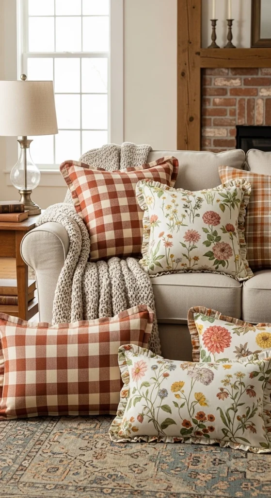 Checks and soft florals bring gentle nostalgia. Look for pillow covers instead of full pillows to save money. Mixing patterns works if colors stay similar. Use these textiles in small doses. A few pillows or a table runner is enough. Washable fabrics keep things practical.