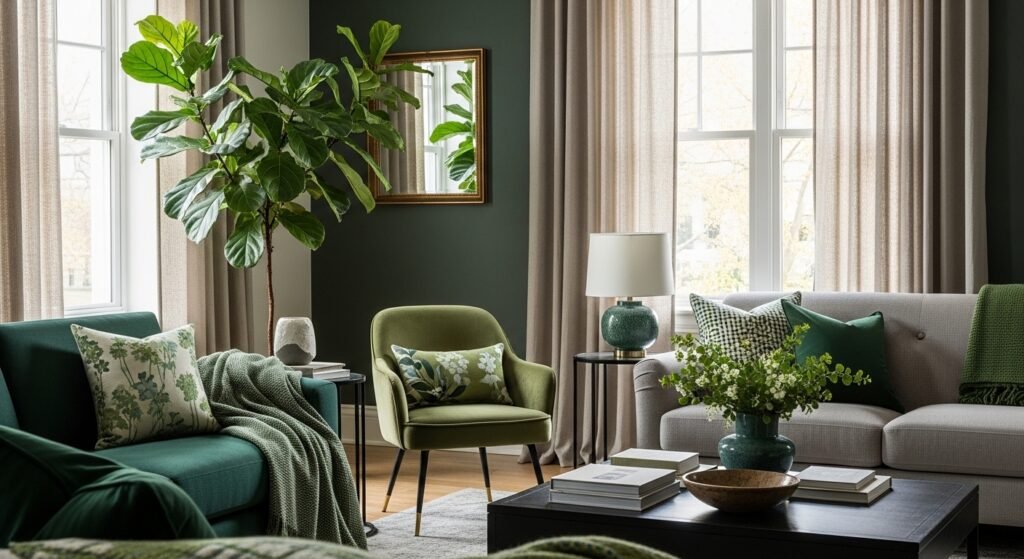 A: Start small with removable items. Green glass vases or pillow covers are quick swaps that can be returned or changed seasonally.