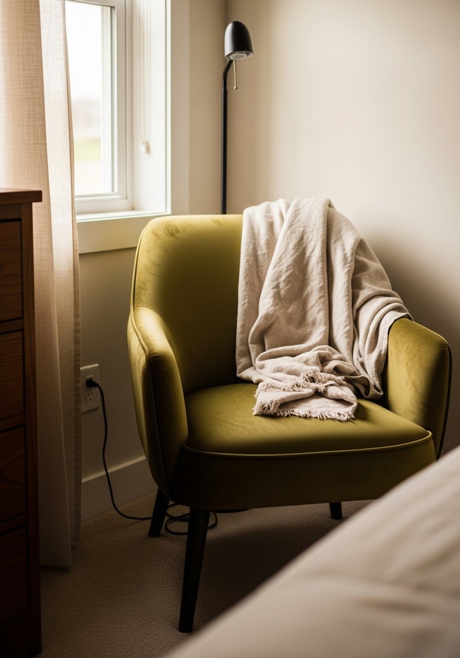 An olive velvet chair anchors my bedroom while staying serene. I placed it near the window with a linen throw and a rattan floor lamp for natural contrast. I found a compact 28-inch-wide chair that fits small corners without crowding. Mistake to avoid: matching the chair to every pillow. Instead, echo the color in one pillow and bring in neutral wood and jute to balance. The chair reads luxe but calming, especially against warm wood floors and soft white bedding.