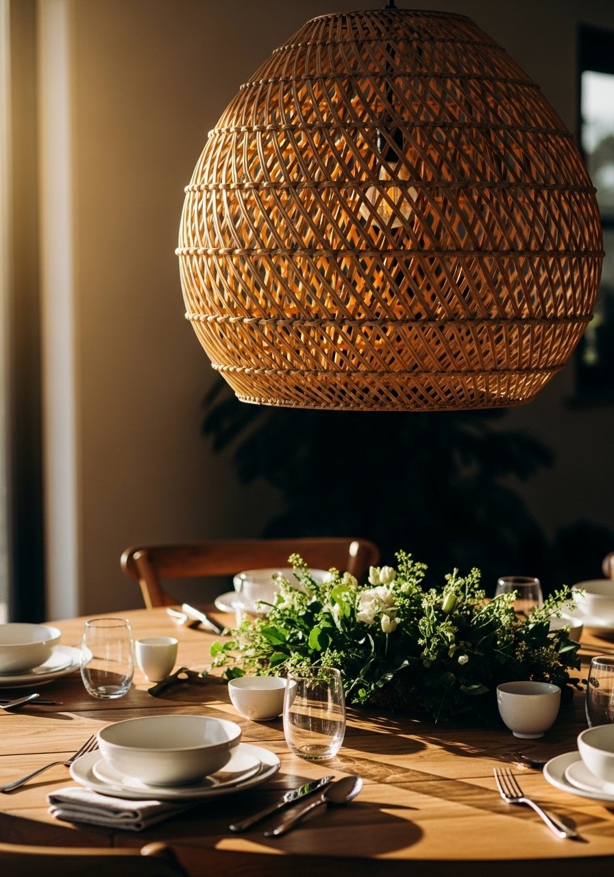 Rattan Pendant Over a Natural Dining Table for Coastal Dining