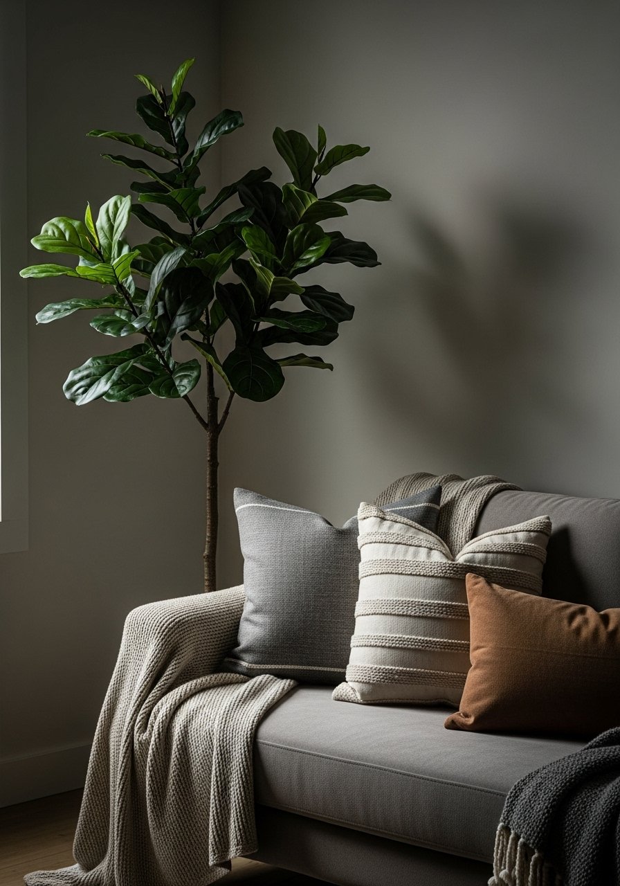 My building gets shady light; a real fiddle leaf fig would struggle. An artificial 6-foot fiddle leaf fig gives height and drama without upkeep. I placed it in a woven basket and staggered small terracotta pots nearby for scale. Mistake to avoid: tiny pots at the base—use at least one mid-size planter alongside. Fake trees now look realistic and are worth it where light or pets make real plants impractical. It calms the eye with vertical greenery.