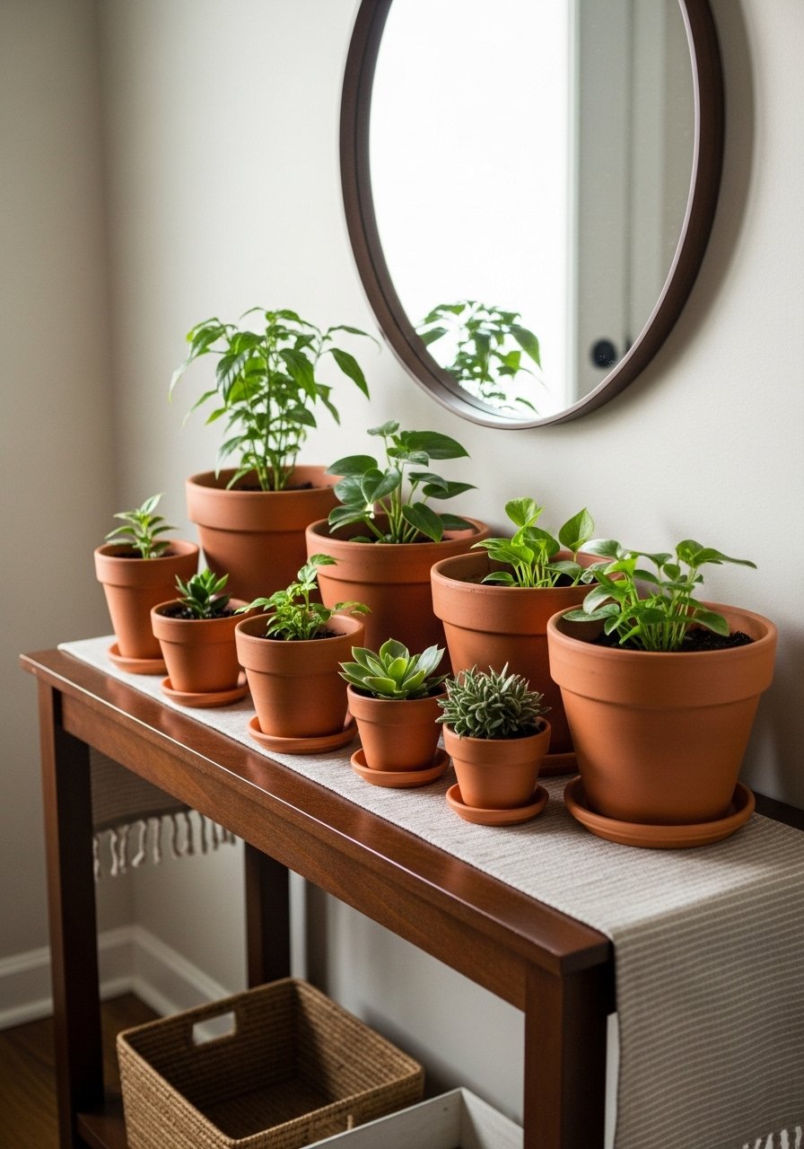 Terracotta Planter Cluster on an Entryway Console for Mediterranean Vibe