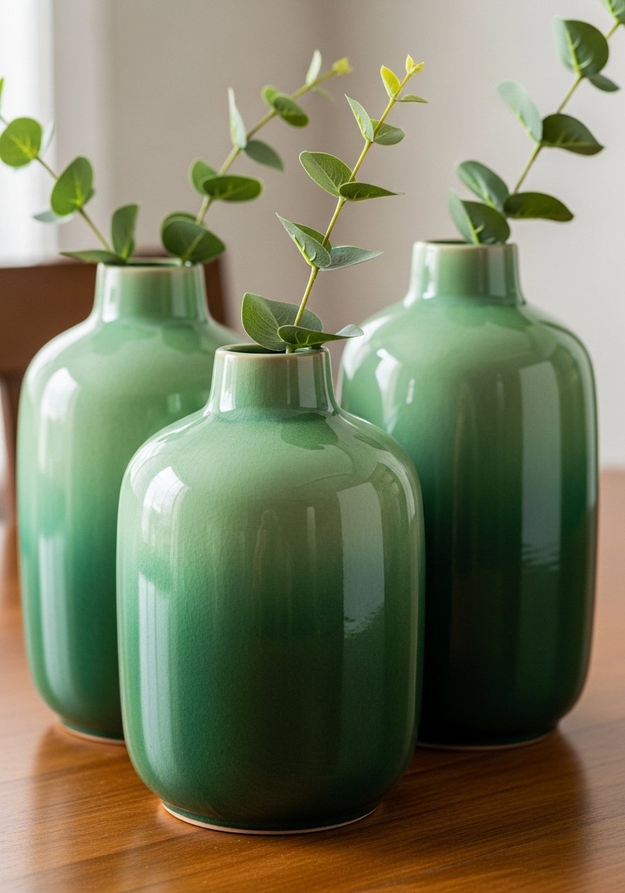 A set of three green ombre vases acts as a quiet centerpiece without shouting. I place them in odd numbers and vary height—12, 9, and 6 inches—to follow visual rhythm rules. Use simple foliage like eucalyptus or olive branches. Common mistake: filling every vase; leave one empty for negative space. These vases add subtle green and ceramic warmth, pairing nicely with oak tables and woven placemats for a farmhouse-meets-modern feel.