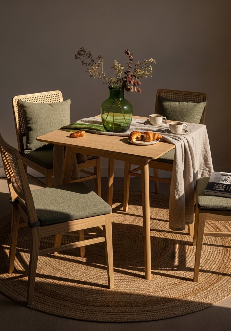 I use a 5-foot round jute rug to anchor my breakfast table. Jute adds texture and the sage cushions tie the floor to the tabletop. Avoid undersized rugs—the rug should extend beyond chair legs when pulled out. I layered a small flatweave rug on top sometimes to add pattern. This setup reads relaxed and durable. Jute looks more expensive than the price and plays well with wooden furniture, linen, and subtle green accents for a quiet coastal appeal.
