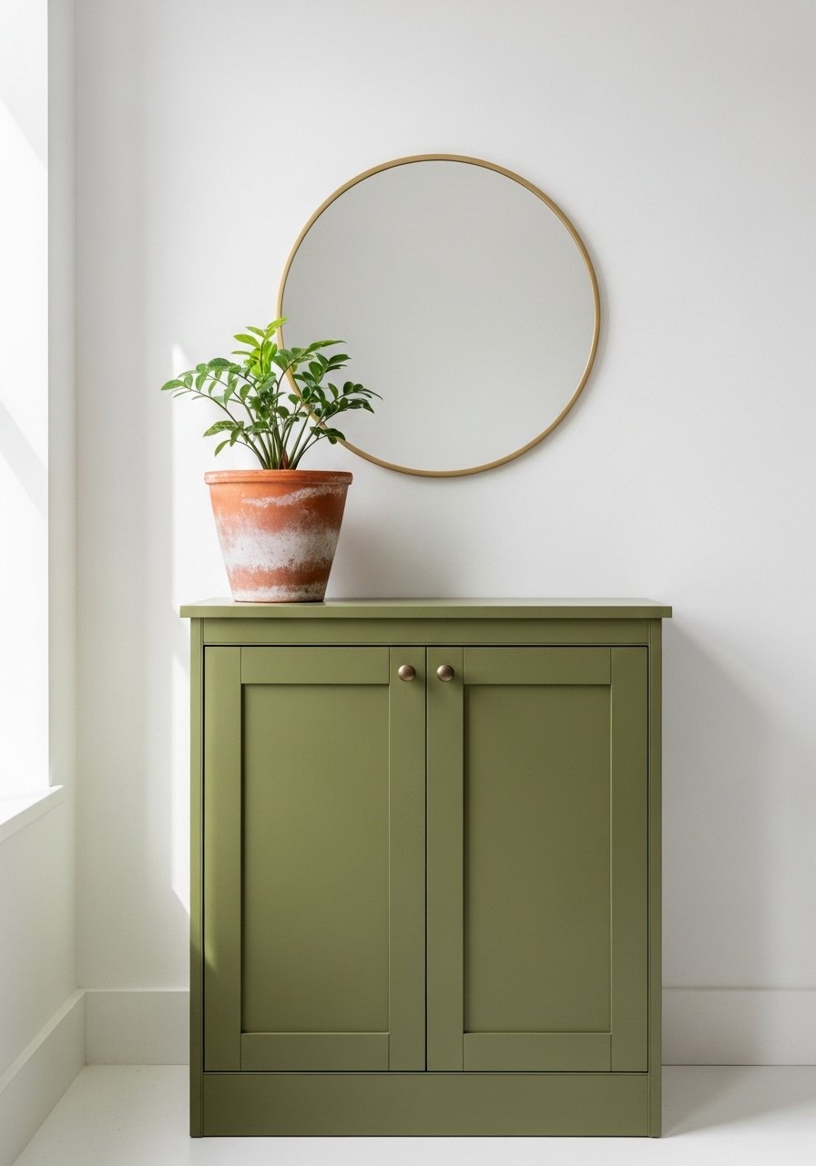 I painted a thrifted cabinet in an olive hue to anchor my entry. It adds personality and hides clutter. I used satin enamel for durability and added brass knobs for warmth. Mistake to avoid: painting hardware the same color—keep it contrasting to read the cabinet’s shape. This green works as a neutral against white walls and pairs perfectly with woven baskets and dried grasses to soften the look.