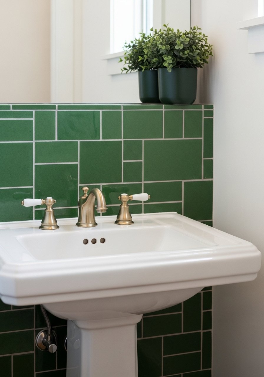 I tiled a small powder room with glass subway tiles in a soft sea-glass green. It reads modern and bright without overwhelming the space. Keep fixtures simple—white sink and matte brass faucet—to avoid clutter. A common error is choosing a tile too glossy for small rooms; pick a subtle sheen to keep reflections soft. This backsplash provides a focused green accent that feels intentional and spa-like, especially when balanced with white grout and natural wood accents.