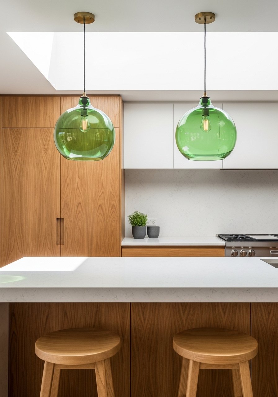 I swapped clear pendants for green-tinted glass shades to warm up my white kitchen. The green glass adds subtle color without committing to painted cabinets. Use dimmable bulbs to control mood. A frequent mistake is pendants hung too low—leave 30-36 inches above the island. These fixtures pair well with brass or black hardware and look current with warm wood stools. The result is layered, modern, and quietly botanical.