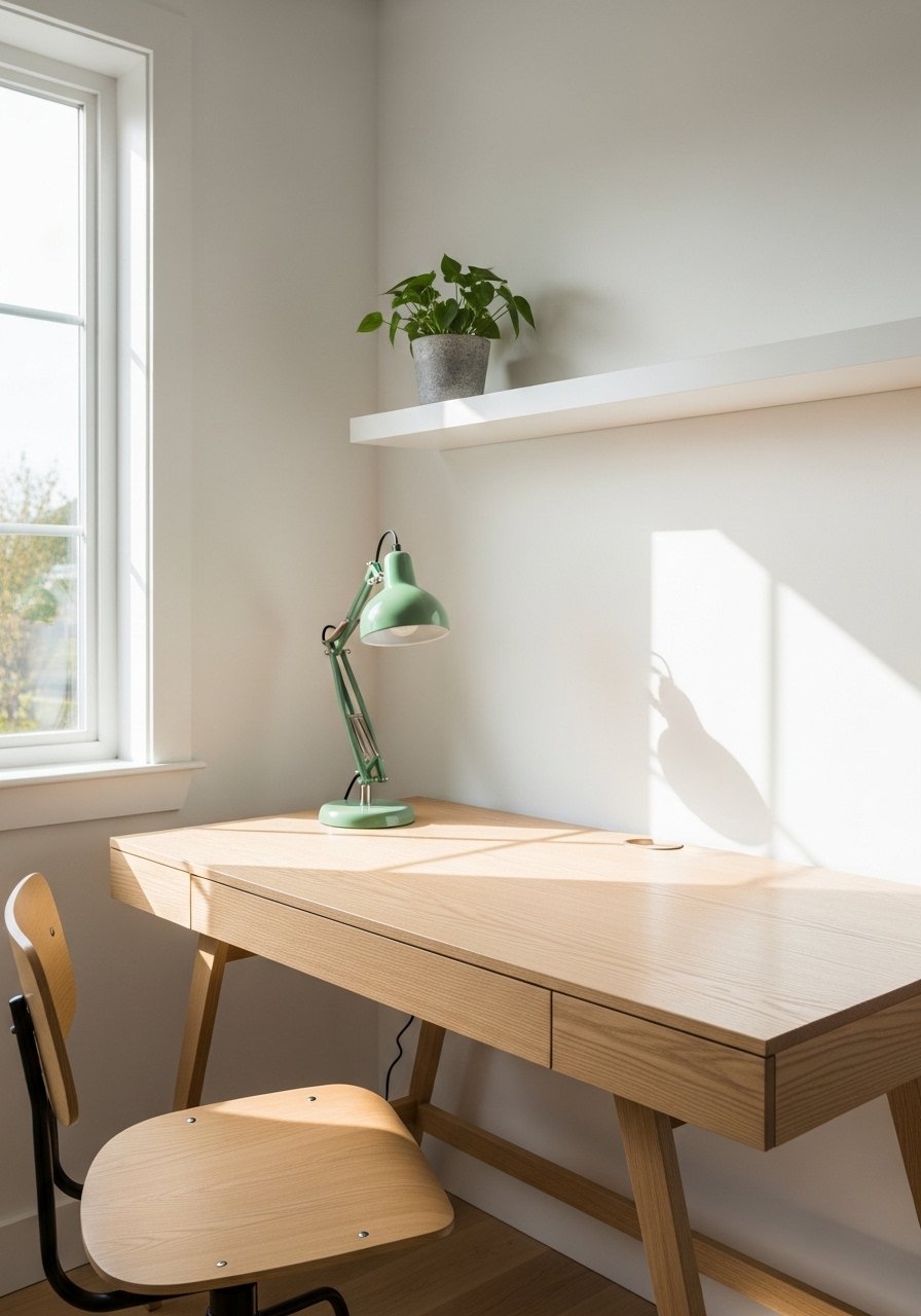 I balanced white oak shelving, a walnut desk, and green accessories to keep the office calm and productive. Add a small mossy art panel for interest and a green desk lamp for task lighting. Mistake to avoid: too many competing wood finishes; pick two and repeat them. Green accessories—lamp, planters, and a small runner—tie the woods together. This palette feels grounded and focused, ideal for a workspace where calm equals productivity.