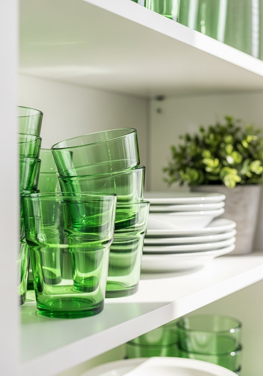 Green-Tinted Glassware for Styling Open Shelves in Entertaining Areas