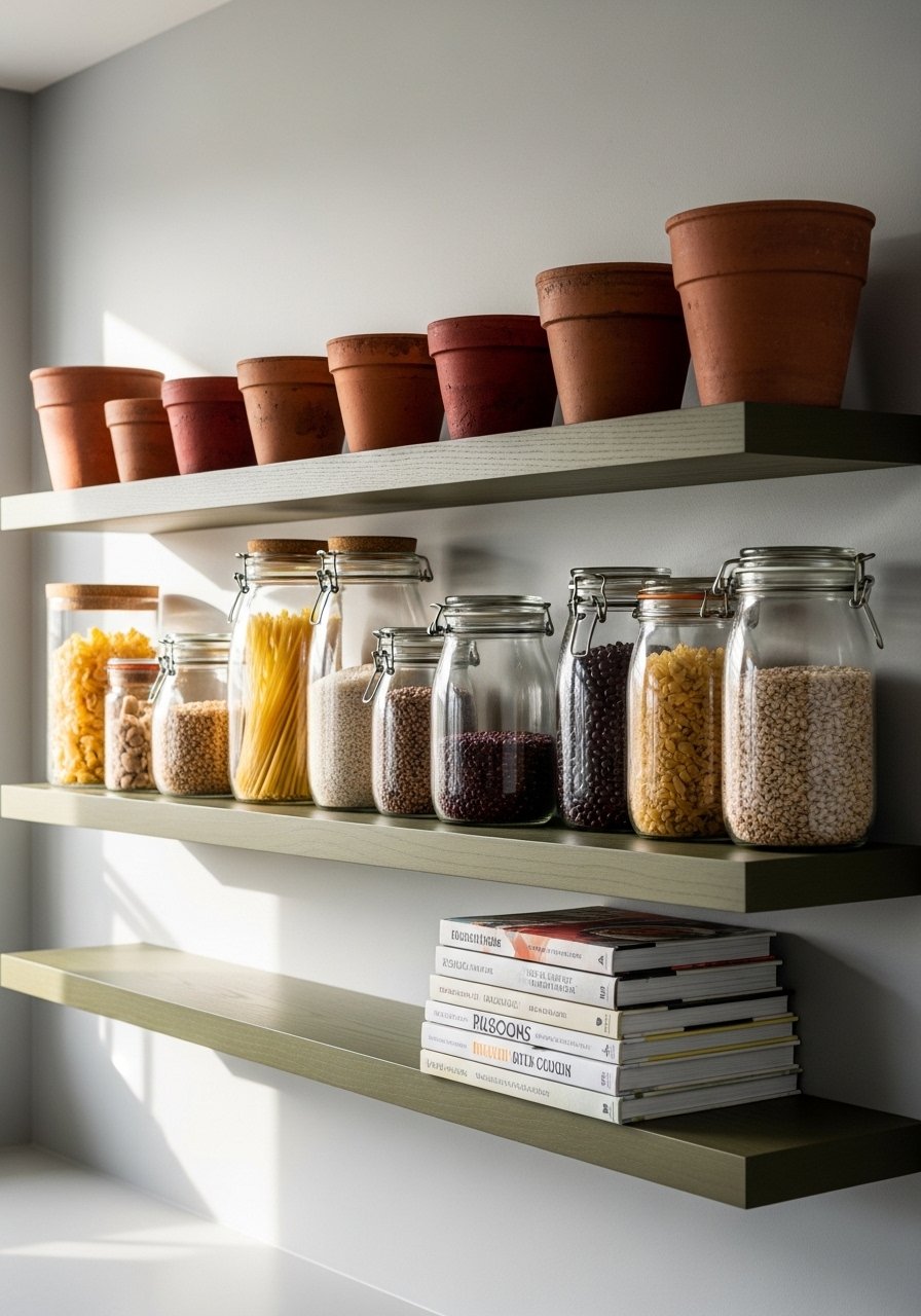 I installed two olive-stained floating shelves above my counter to provide warm green undertones without painting the walls. They hold herbs, jars, and a small teapot. Keep shelf depth shallow—10-12 inches—to avoid crowding. A common mistake is overloading shelves; use height variation and odd numbers for balance. These shelves give rustic kitchens a subtle color lift and pair beautifully with white tile and brass hardware for an updated country feel.