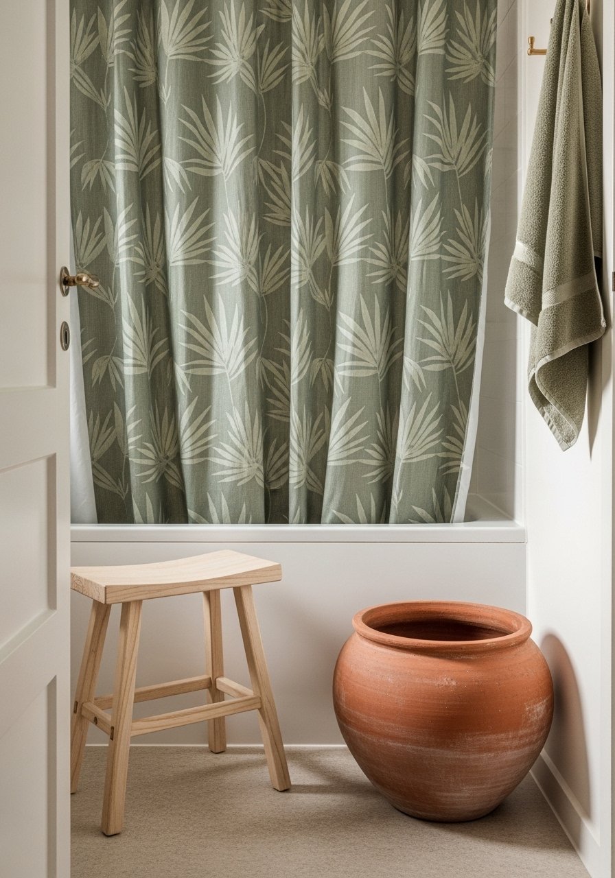 I swapped my plain curtain for a palm-print shower curtain in soft sage tones. It instantly made the bathroom feel like a coastal retreat. Pair with white towels and a wooden stool for warmth. Mistake to avoid: pairing with patterned tiles—keep tile neutral. This update is budget-friendly and renter-safe, plus it brings a large visual green element that reads botanical rather than loud, setting a calm scene for a quick refresh.