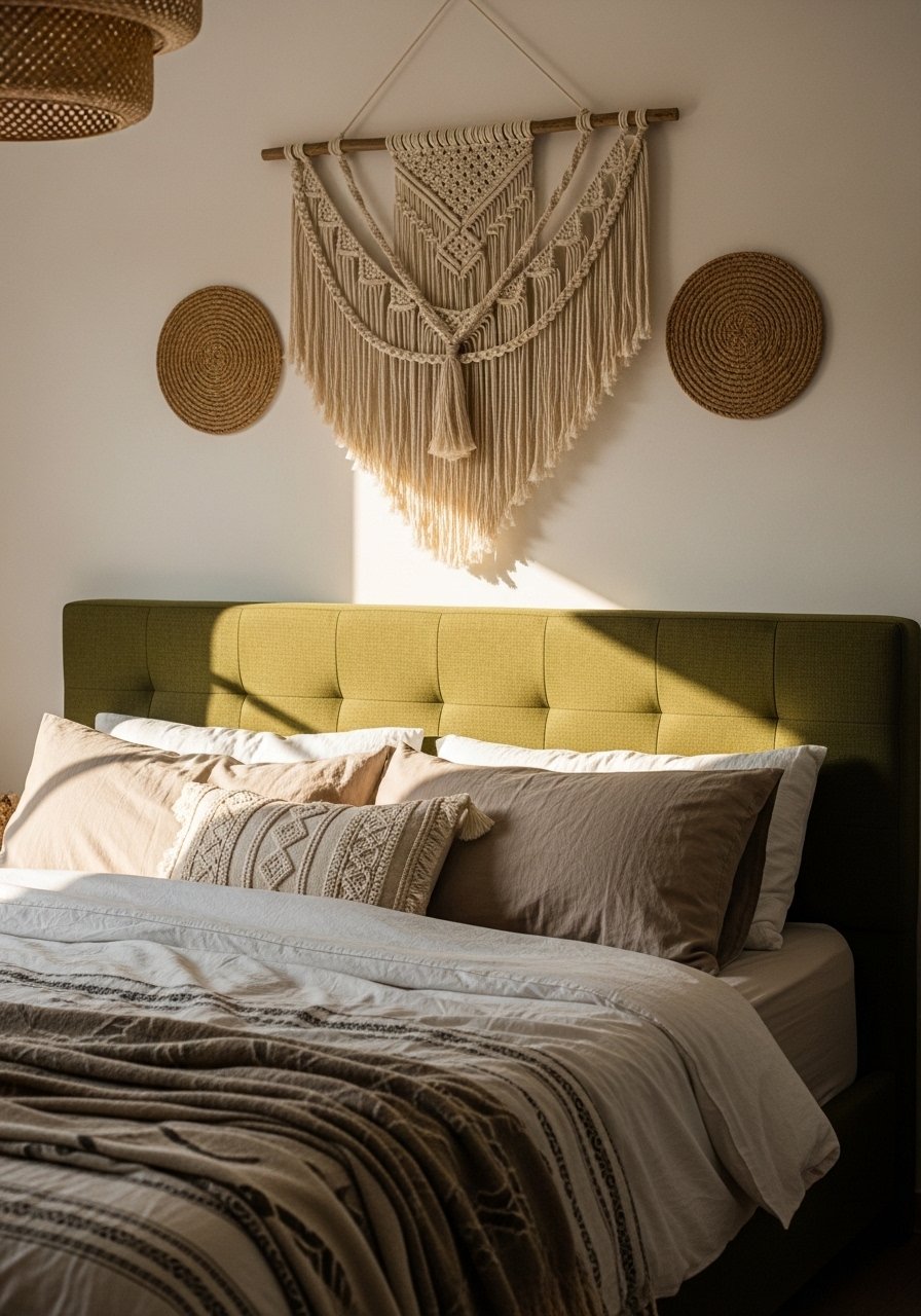 I reupholstered a simple headboard in a muted olive velvet to anchor my bed. It creates a restful backdrop without needing wallpaper. Use neutral sheets and mix textured throws. One mistake is choosing a headboard that competes with patterned linens—keep bedding simple. The headboard reads cozy and intentional and pairs with rattan nightstands and woven baskets for that boho collected look.