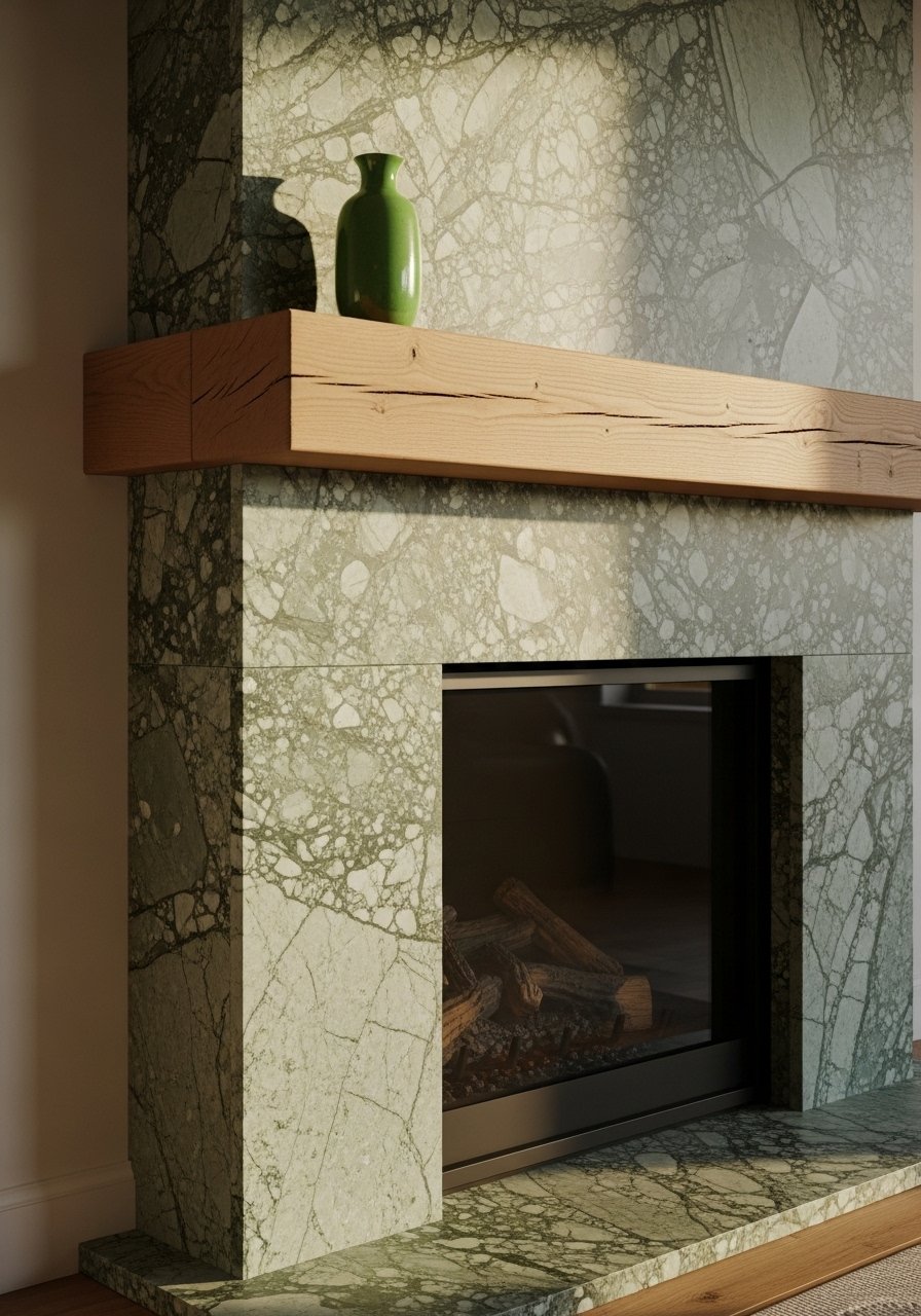 I swapped a painted surround for a natural stone tile with faint emerald veining to give my mantel depth and a soft green highlight. Use minimal mantel styling—one large mirror and two small vases—to let the stone speak. Mistake to avoid: over-accessorizing; the stone should be the focal point. This is a slightly splurge move that yields a quiet, luxurious green accent without relying on paint or wallpaper.