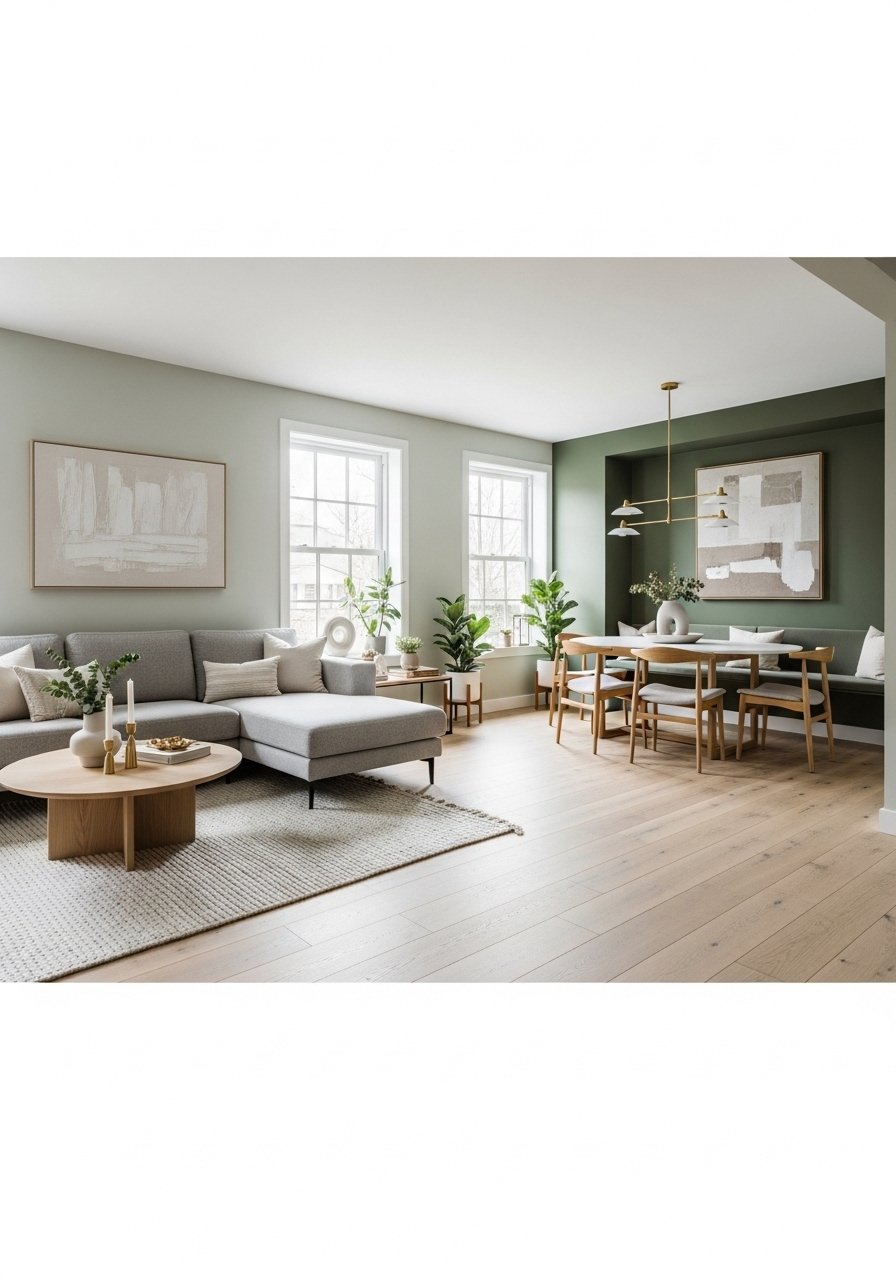I used two complementary green paints—pale sage for the living area and deeper olive in the dining nook—to define zones without walls. Keep transitions soft by repeating a neutral element like oak trim. Mistake to avoid: abrupt color changes; use a slim vertical molding or art to bridge shades. This approach creates cohesion while giving each area its own mood and is a fresh alternative to accent walls or furniture-only zoning.
