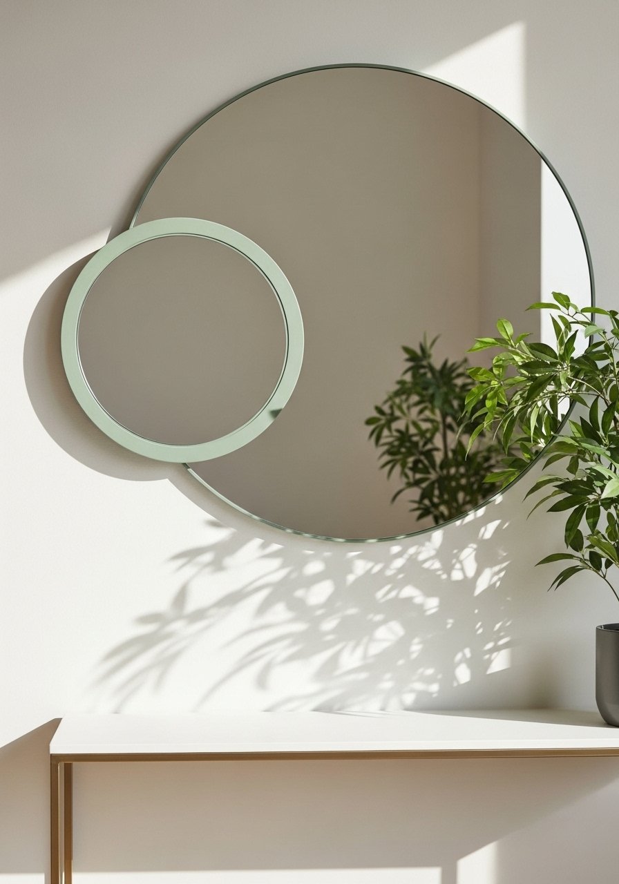 I layered a 36-inch round mirror with a smaller green-trimmed mirror to reflect more light and give depth. Mirrors open tight spaces visually. Avoid placing mirrors opposite clutter—reflect calm areas for best effect. The green trim gives a hint of color without dominating. This trick brightens small rooms and reads intentional when paired with natural textures like jute and oak.