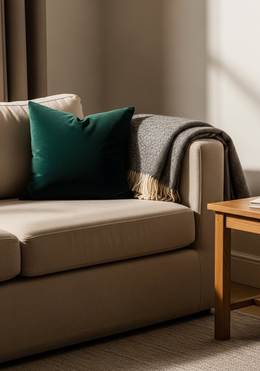 I switched from gray to warm beige and everything softened. Adding a single jewel-tone cushion — emerald or deep sapphire — made the room feel intentional, not sterile. I once bought a bright blue accent that clashed with my wood tones; darker jewel tones read richer and sit better with warm neutrals.