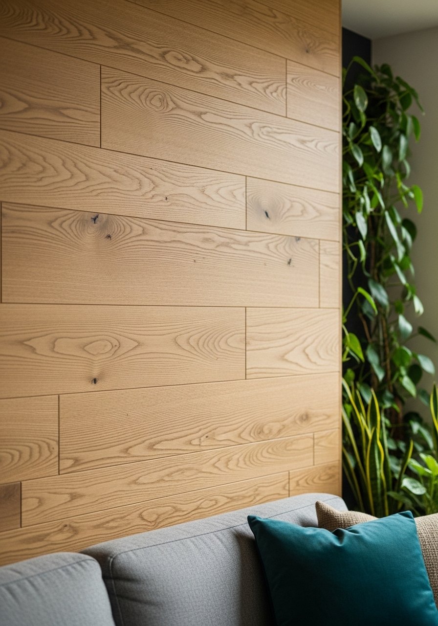 I added raw wood planks behind my sofa to stop the room from feeling staged. The texture reads like something loved, not brand-new. My first attempt used a stain that was too orange; I sanded and re-finished to a lighter tone and it finally felt right.