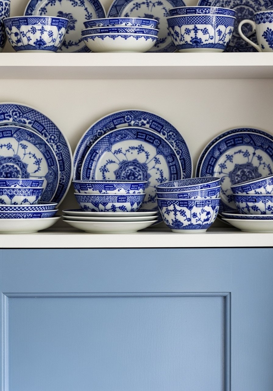 I painted a lower cabinet powder blue and grouped blue-and-white porcelain on open shelves. The pairing feels classic but relaxed. I once overdid the blue and it read childish; choosing a muted powder blue solved that instantly.