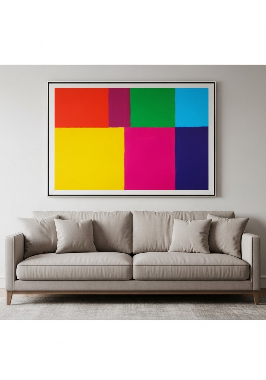 Choose scale that fills the space and complements cushion colors. It’s an easy way to refresh without repainting. Tip: ensure the art’s lower edge sits about 8-12 inches above the sofa back.