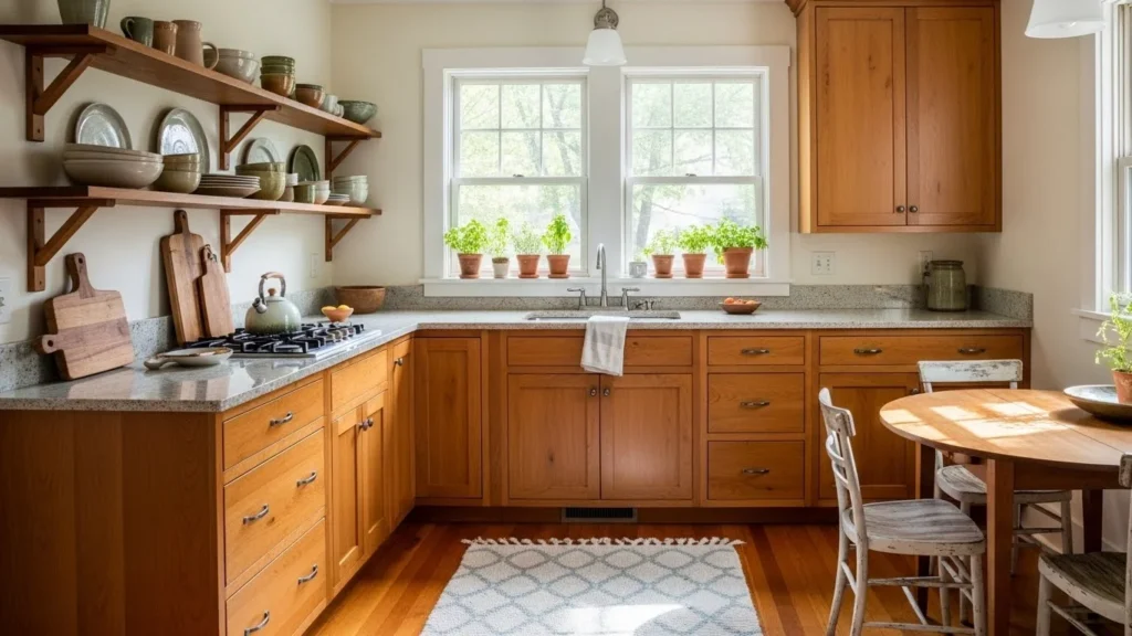 A cozy kitchen should feel personal, not staged. Open shelves help with that.