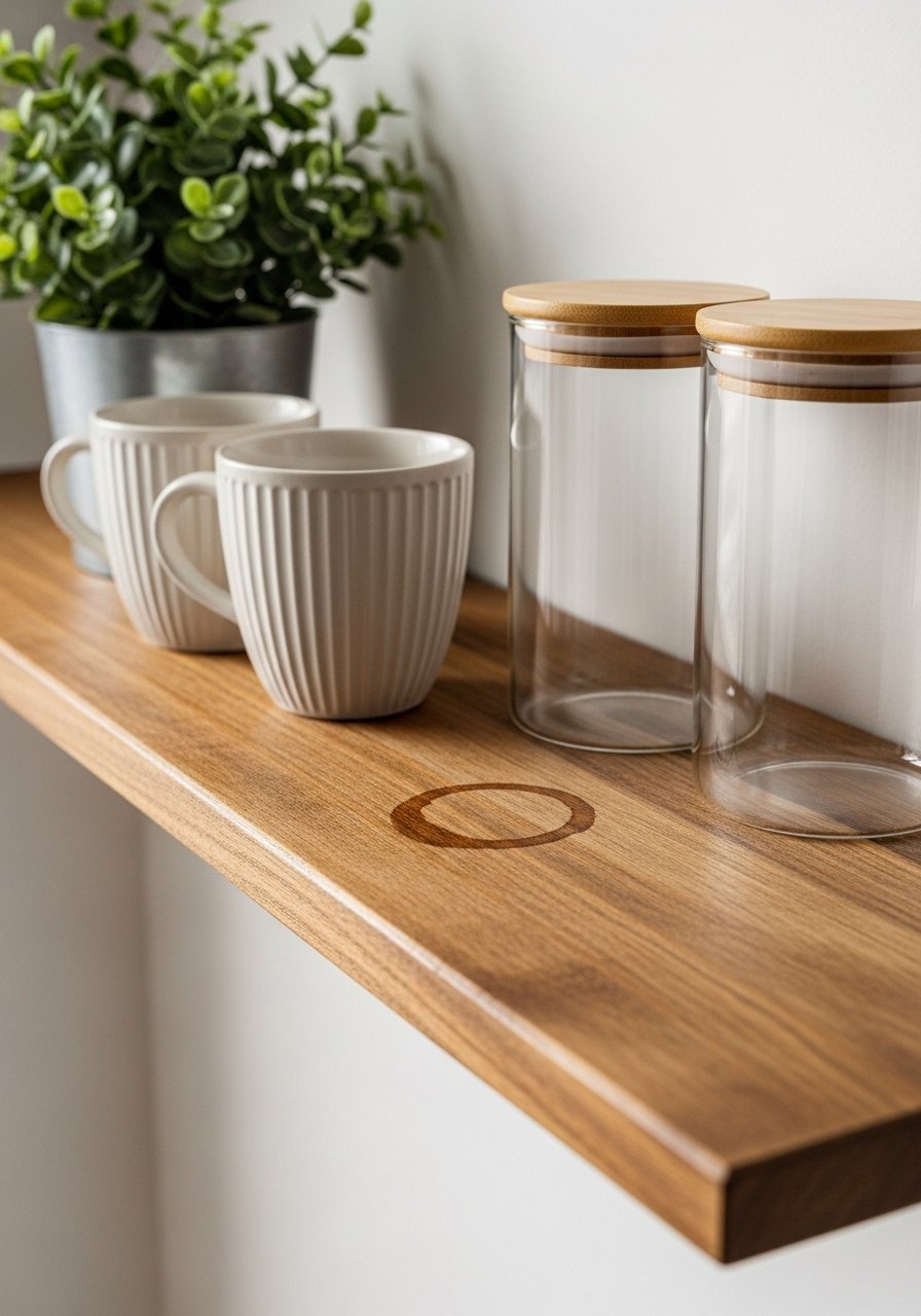 Shallow shelves keep the coffee corner feeling light while giving you practical storage. I install one or two 10–14 inch-deep shelves staggered vertically so mugs and jars sit casually, not stacked like a store display.