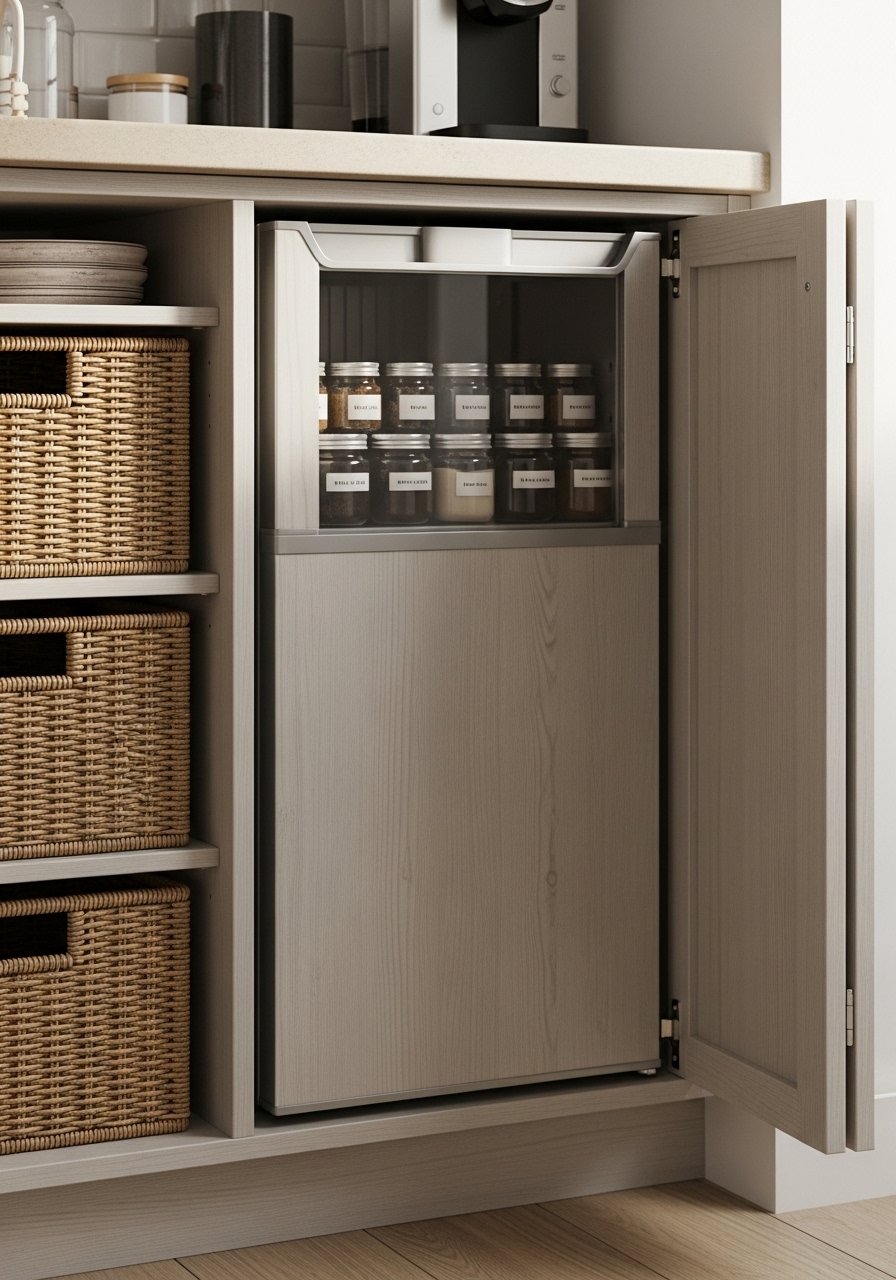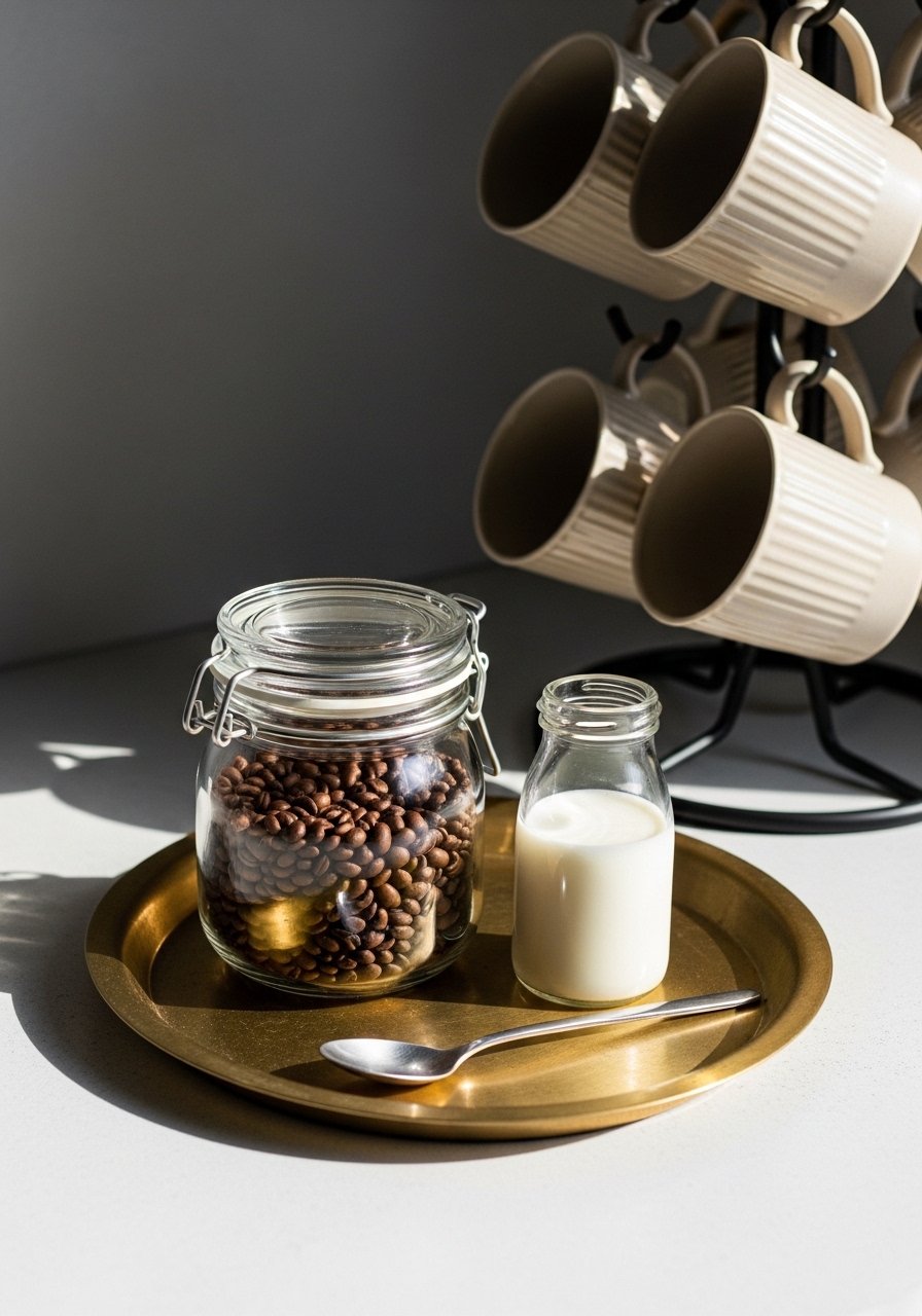 I keep only what I use daily out. Extras—filters, pods, backup beans—live in a lower drawer or a basket. If you use milk alternatives often, tuck a compact mini fridge under the counter. This keeps the top plane calm.