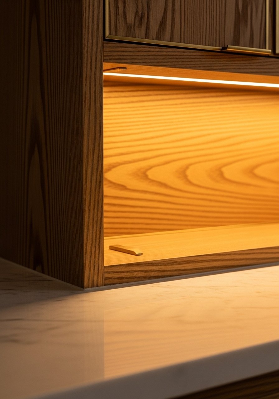 Light changes everything. I add a warm under-shelf strip or a small puck light so the nook reads cozy at any hour. Warm wood lining or a neutral painted back instantly softens the area against white cabinetry.