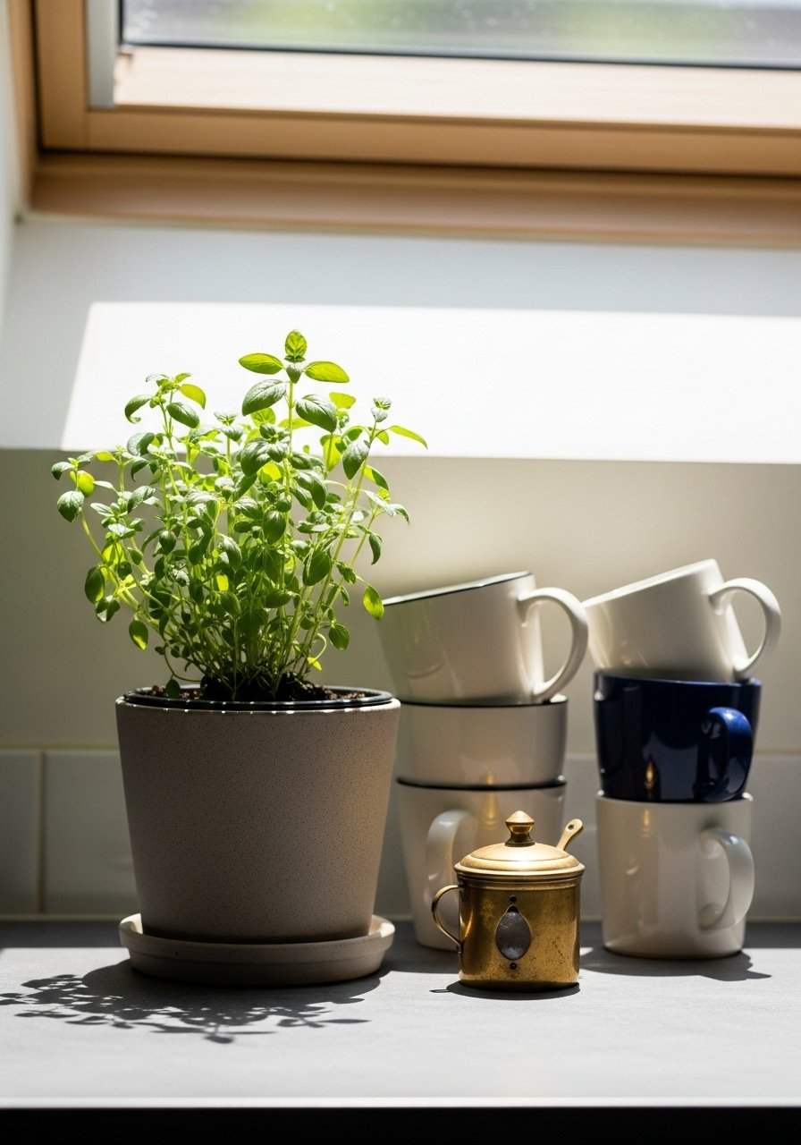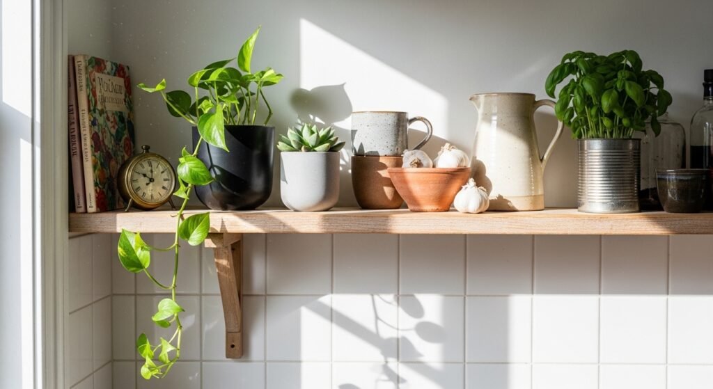 I like a live herb pot to add color and scent. Choose a 4-inch pot so it never overwhelms. Pair it with a useful object, like stacked mugs or a brass salt cellar. That mix keeps the shelf looking lived-in and purposeful.