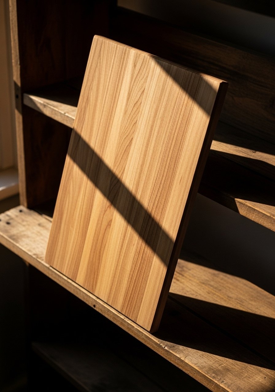 Start with a tall backdrop like a walnut cutting board or a cookbook stand. I lean one board vertically on the left or center. It gives height and a warm plane to tuck other items against. When done right, the shelf reads as a composed picture rather than a line of objects.