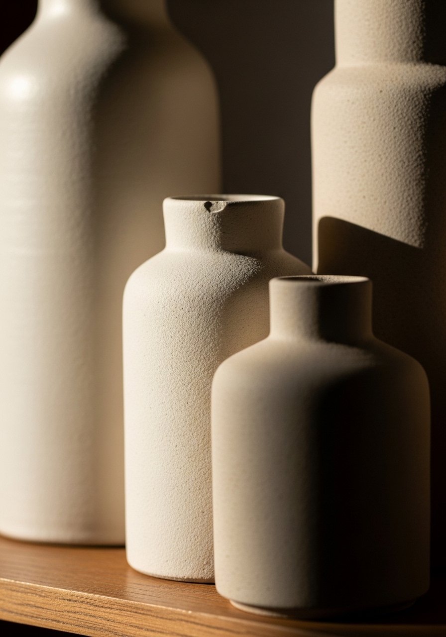 This is where the shelf starts to look styled, not cluttered. Group items in odd numbers, usually three. I place the set of matte vases together. Keep the group width to about one third to one half of the shelf length. That proportion prevents a blocky look.