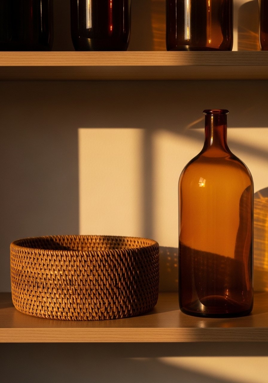 Finish by adding texture. I tuck a medium rattan basket below or to the side to ground the shelf. A vintage amber bottle reflects light and gives a little visual sparkle. Small metallics like a brass salt cellar act as anchors.
