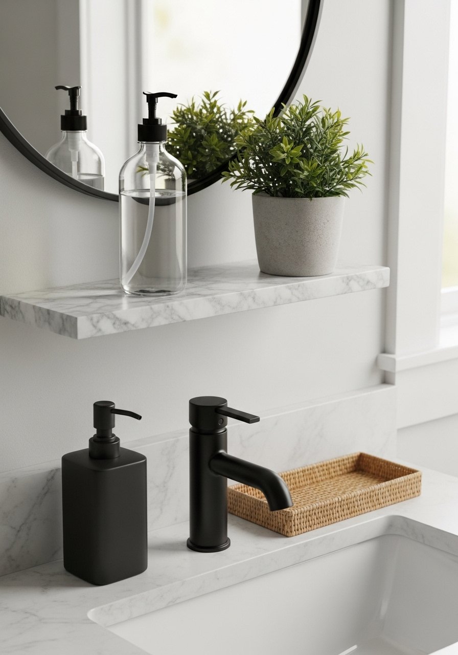 What changes: the space stops shouting "staged" and starts reading as lived-in. Insight people miss: the faucet and single focal object (lamp or art) should compete very little. Mistake to avoid: adding extra decorative pieces to hide that you didn’t edit—less is deliberate.
