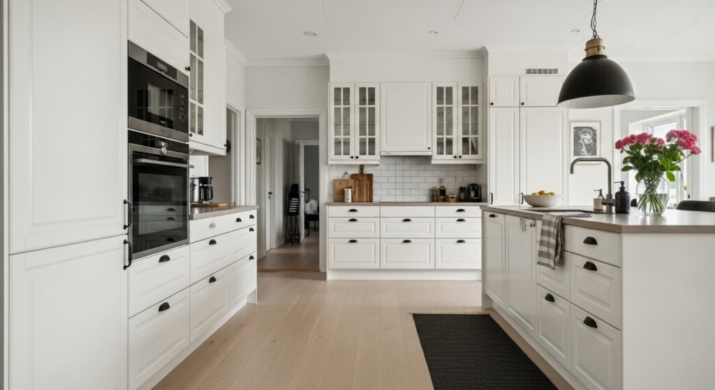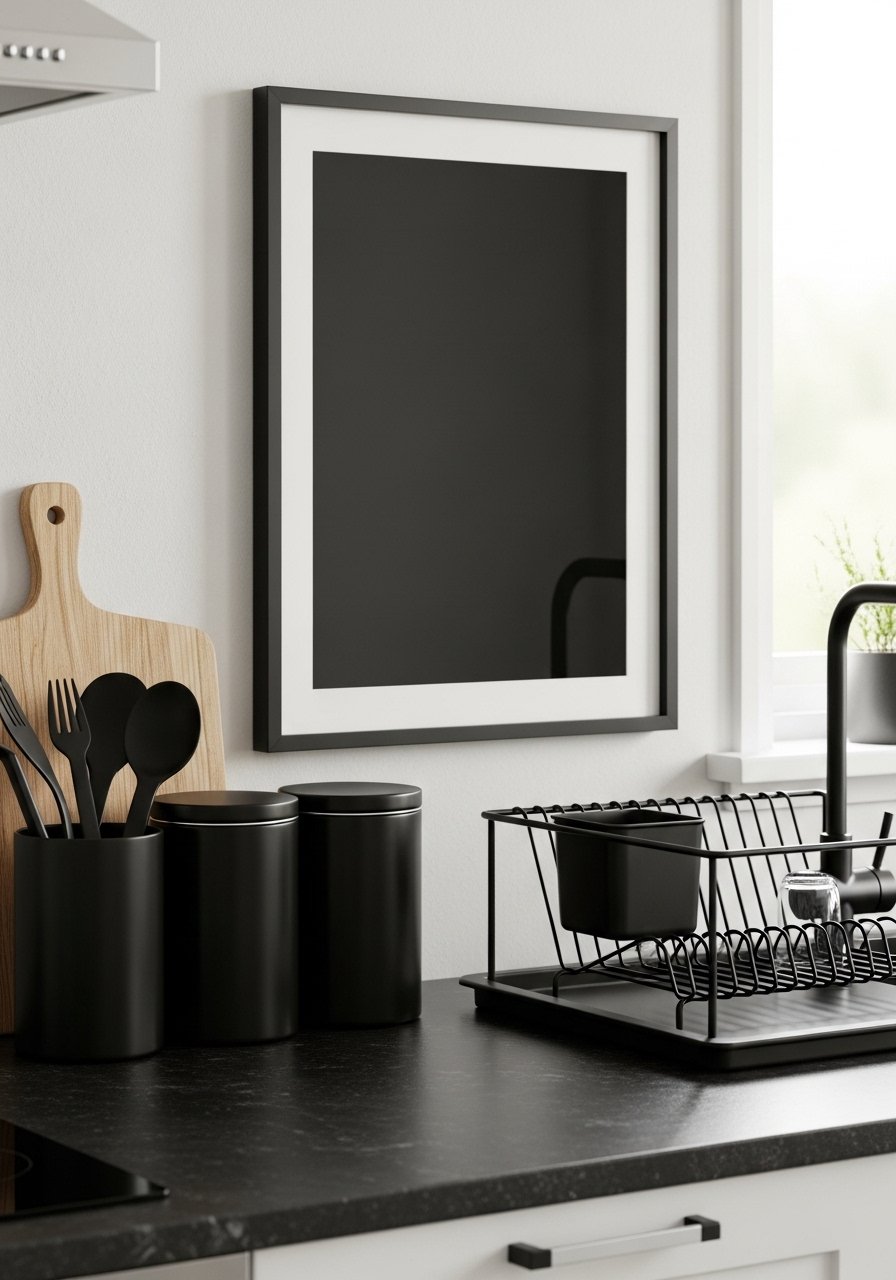 After anchors, I repeat black in smaller places—canisters, a dish rack, picture frames. It creates rhythm without shouting. I place repeats at roughly eye, counter, and floor levels so the color feels intentional.