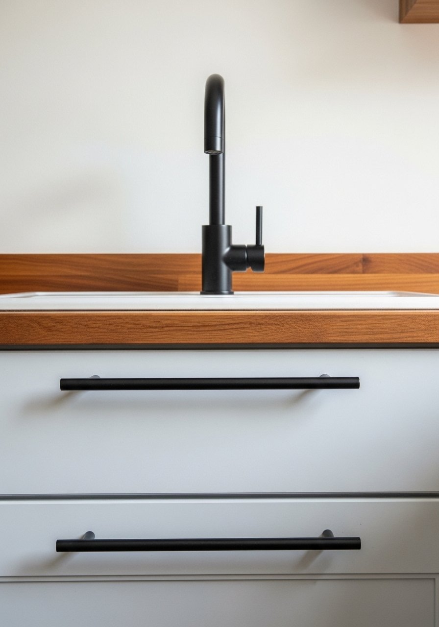 In a small kitchen I keep anchors compact: a black faucet and two black frames. Scale matters—choose slim bar stools and a narrow runner so black doesn’t crowd the floor.