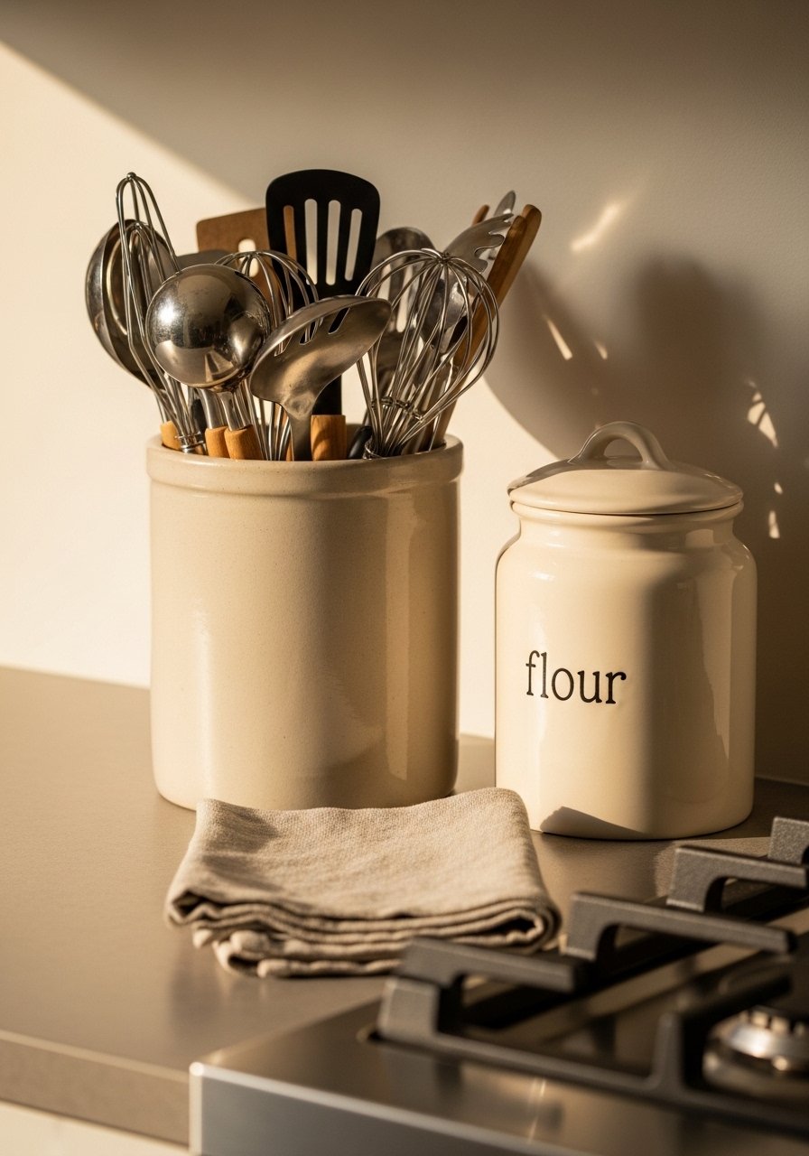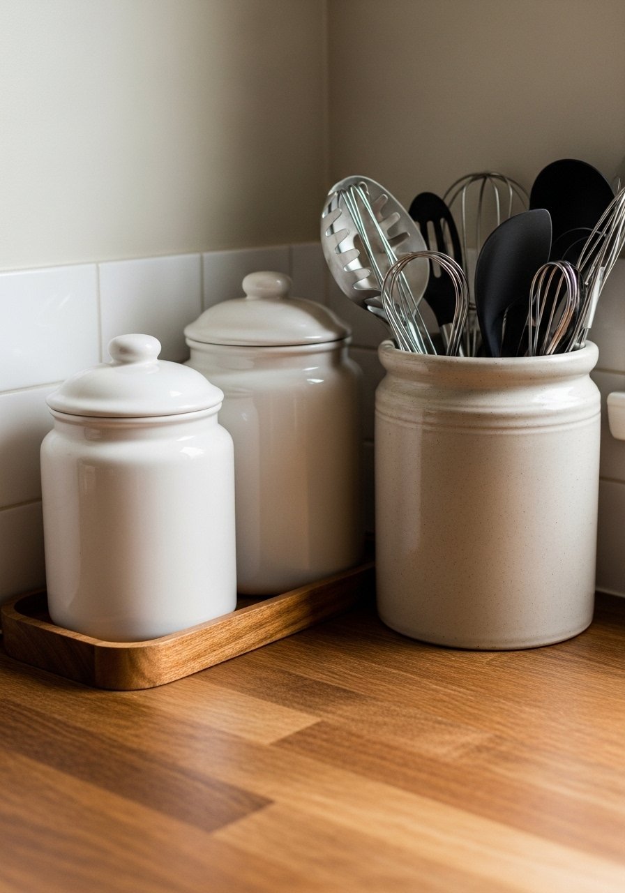 I balance pretty with practical. The utensil crock lives by the stove. Canisters for flour or sugar sit where I reach for them. That way jars feel useful, not just decorative. Function keeps styling honest and less fussy.