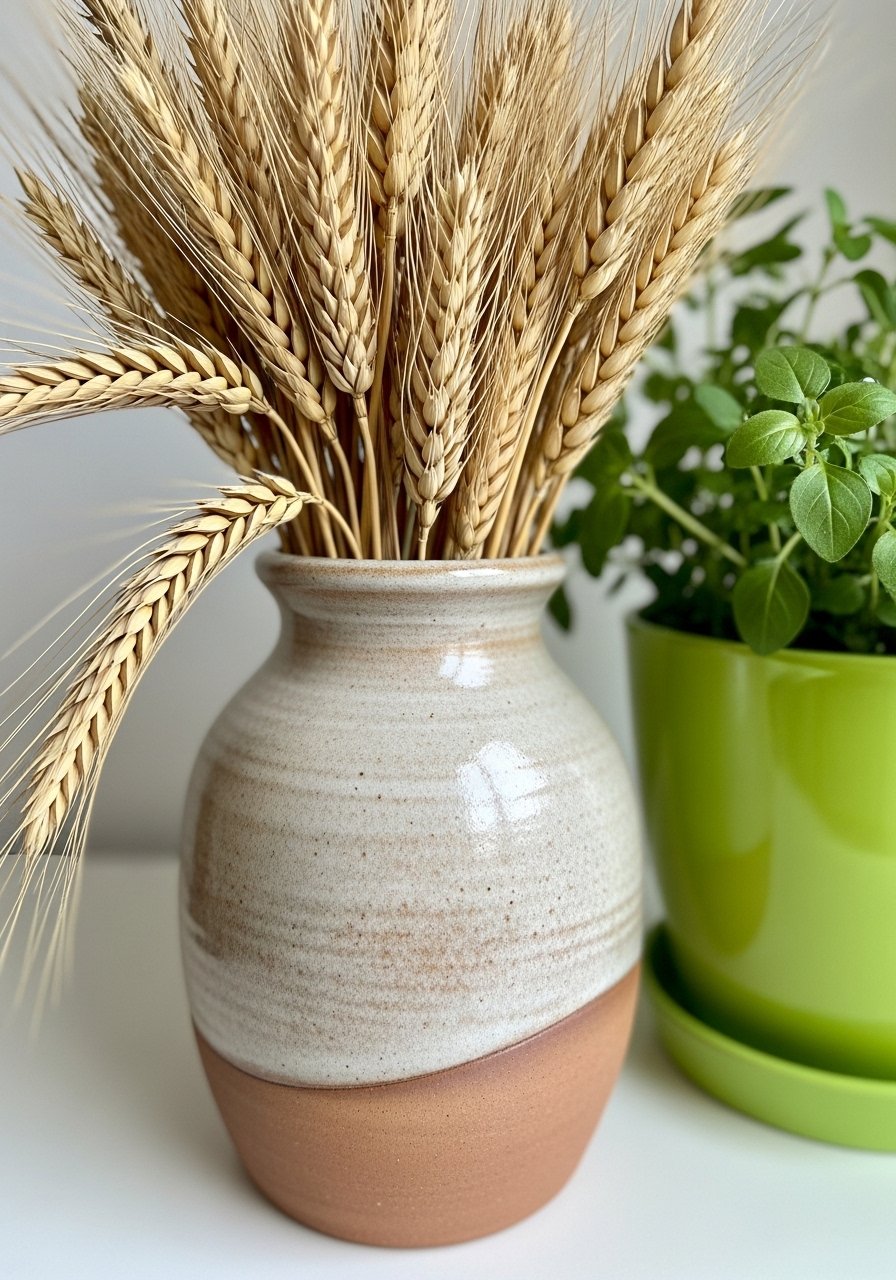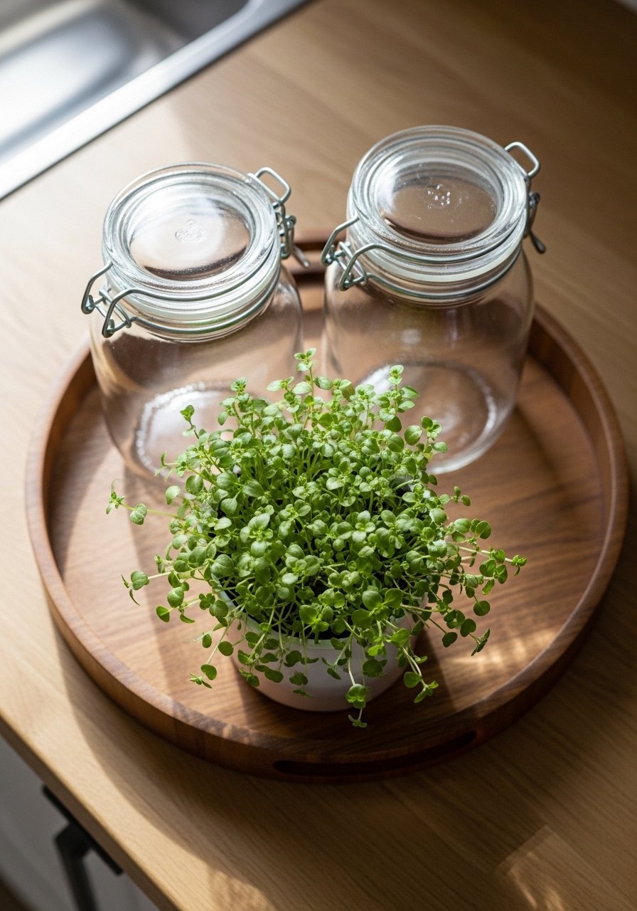 I tuck in one living element—an herb planter or a stem bundle—to soften the ceramics. Dried stems are great in winter; a small basil pot works in summer. This adds movement and keeps the look from feeling cold.