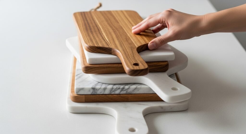 I start by laying everything out. I pull a few big boards, a couple of small paddles, and one marble piece for contrast. Seeing them together helps me aim for balance — long and short, dark and light, rough and smooth. The visual change is immediate: the pile feels like a mini collection, not random clutter. One insight: less is more — keep a dominant board plus two or three supporting pieces. Don’t make the mistake of matching every board; identical tones read flat. I look for variety in shape and material.