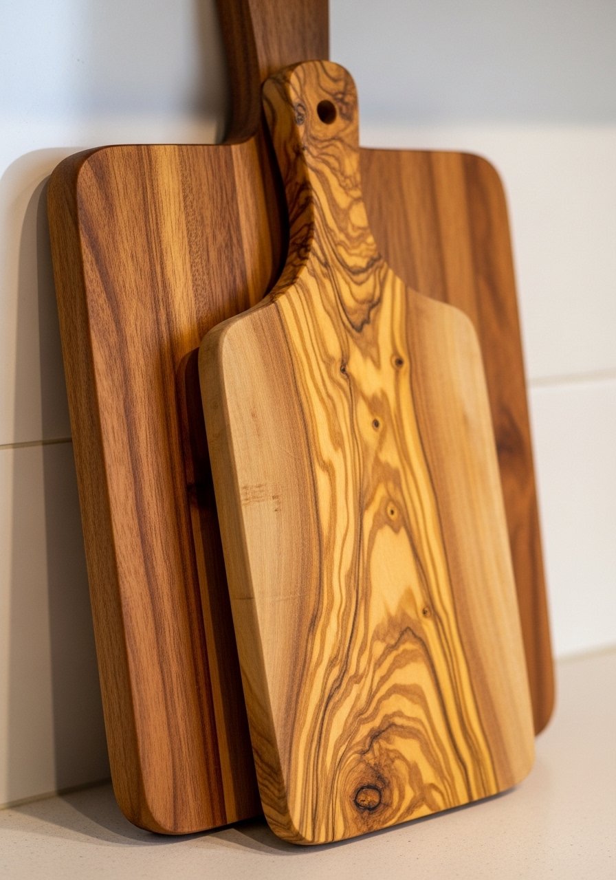 Start with one big board and one small supporting piece. Place them where you spend most time in the kitchen. I often start with a simple olive wood paddle — it’s affordable and immediately warms the space. Style slowly, use the boards, and tweak placements until it feels balanced.