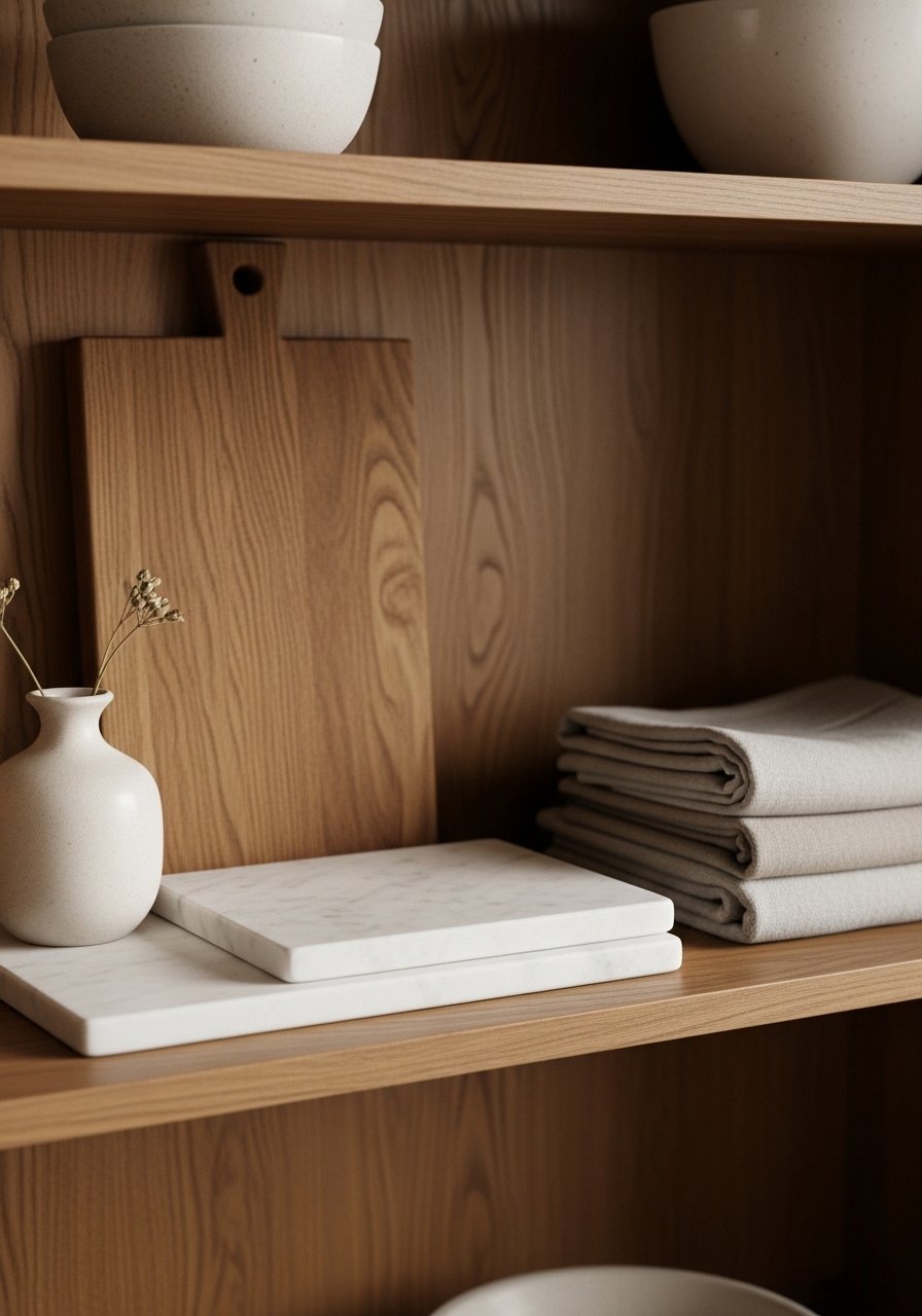 On open shelves and islands I create small vignettes. I place a marble board as a base, lean a wood board behind it, then add a small vase and folded linen towel in front. This balances hard and soft textures. The visual change is a cozy, edited shelf instead of scattered items. One insight: odd numbers read better—group three items and vary heights. Avoid the mistake of crowding a single shelf; give each vignette breathing room so it reads calm and intentional.