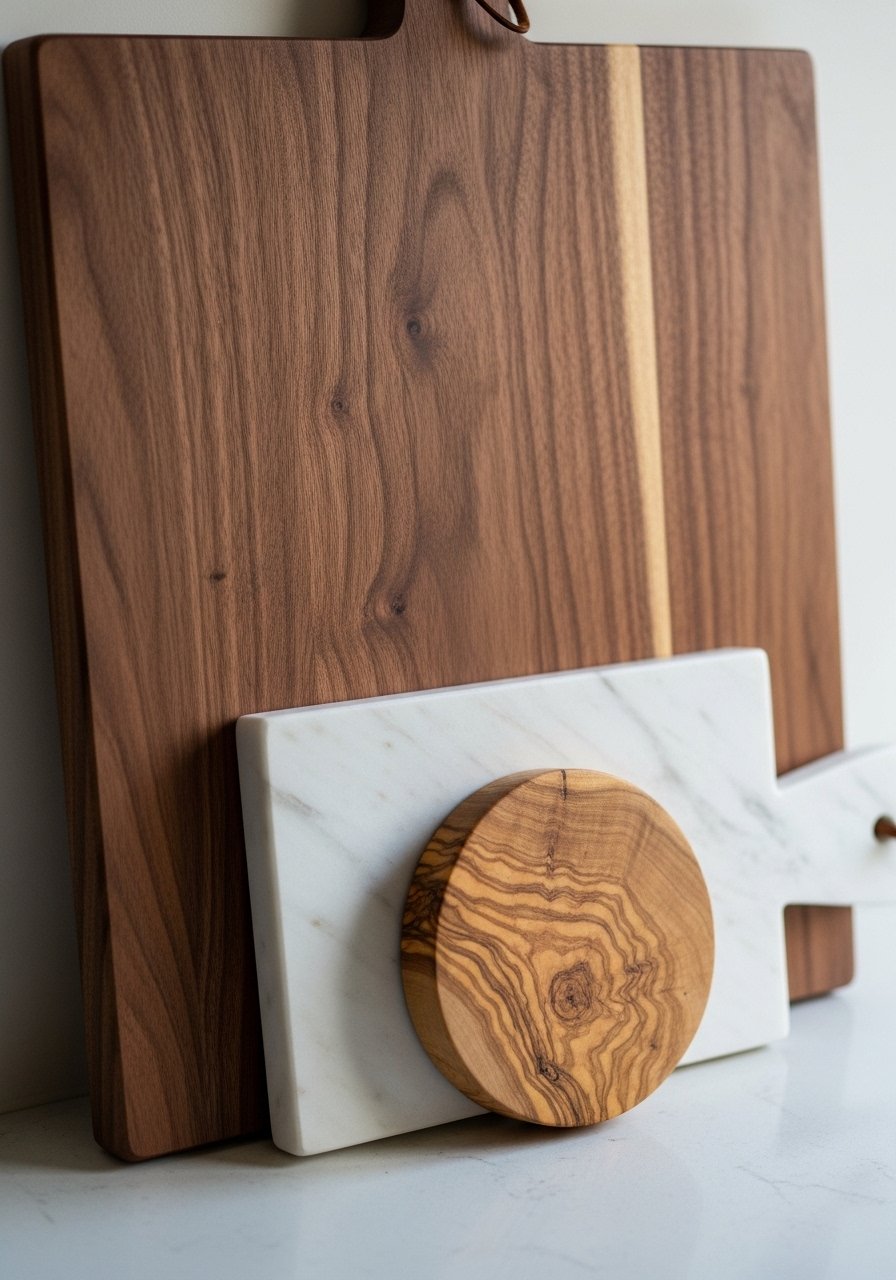I mix round with rectangular and marble with wood. The contrast makes the arrangement feel collected. I usually place a round or paddle slightly overlapping a rectangular board to soften hard lines.