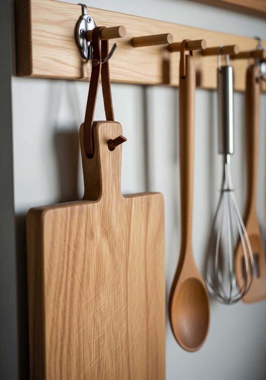 Empty wall space is an easy win. I hang lighter boards with leather straps or prop a few upright against a backsplash. It frees counter space and draws the eye up, which helps kitchens feel taller.