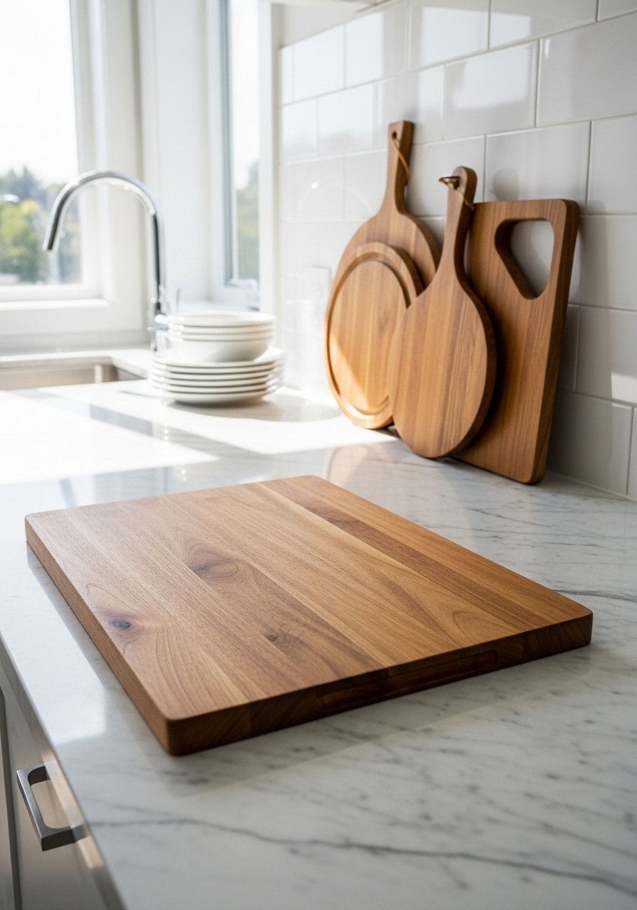 Cutting boards fixed that. They add warmth, texture, and a collected look without fuss. I’ll show you how to place them so the kitchen reads intentional, not cluttered.