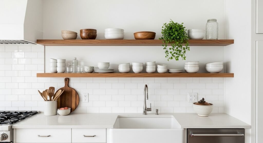 I’d had a kitchen that felt closed-in and a little cold. Cabinets hid everything. The countertop looked heavy. Floating shelves seemed like a quick fix, but I was worried about clutter and a messy look.