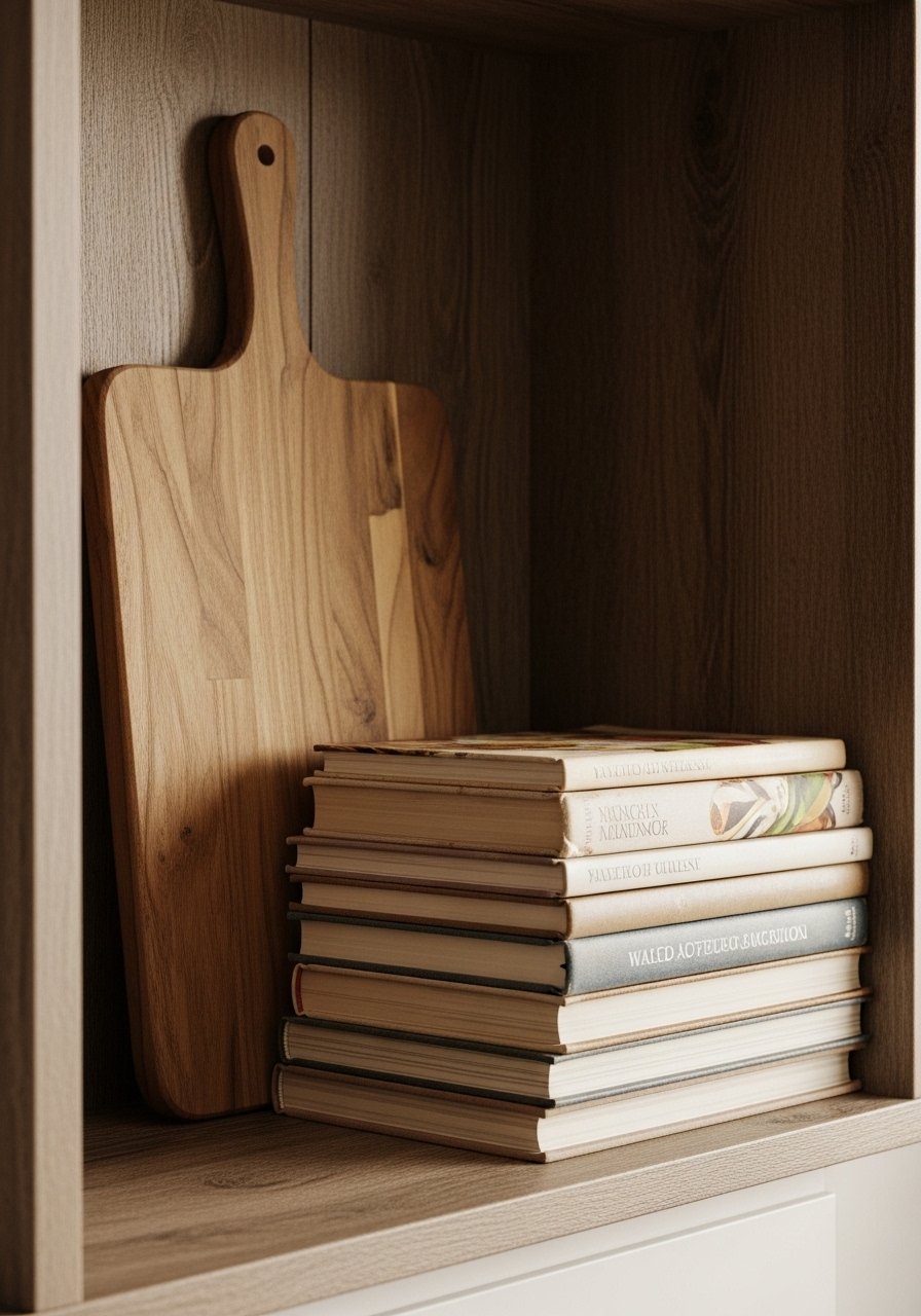 I always place one taller object at each end—often an acacia cutting board or a tall ceramic canister. That anchored edge keeps the eye moving and prevents a shelf from looking top-heavy in the middle.