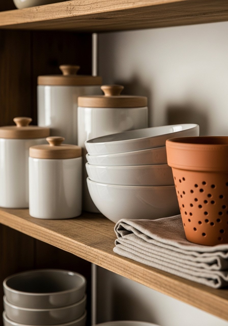 I match the materials to what’s already in the kitchen. For organic modern, I lean into warm wood, clay, and linen. For farmhouse, pick white ceramics and galvanized accents. For japandi, keep shapes minimal, use two-tone neutrals, and emphasize negative space.