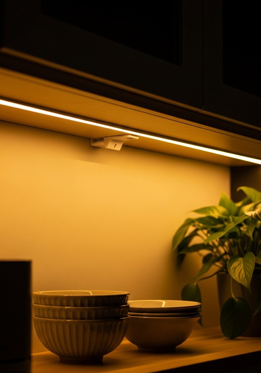 Lighting makes the shelves read as thought-out, not tacked-on. I add a warm white LED strip under the bottom shelf or a small lamp on the countertop. Then I swap in seasonal items—fresh herbs in spring, heavier ceramics in winter.