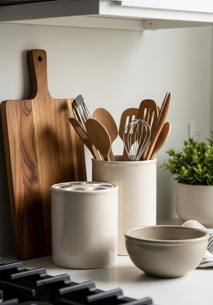 I start by picking one small area as the visual anchor—usually the counter by the stove or sink. I cluster three functional pieces: a utensil crock, a cutting board turned sideways, and a prep bowl. Together they read like a vignette instead of random clutter.