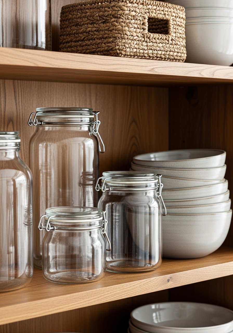 Open shelving can look showy or useful. I mix functional containers (like glass canisters) with everyday dishes and one woven basket for small bits. Use consistent color and material tones—neutrals and wood—so the shelf feels calm.