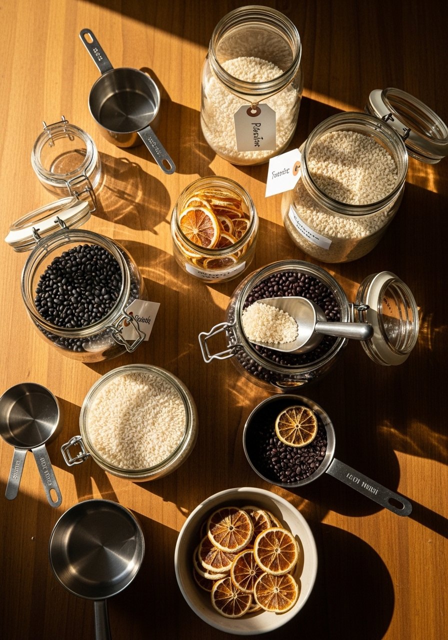 I decide what each jar will hold before filling it. Function first. Then style. I use pantry staples that show texture, such as white rice, brown sugar, lentils, and dried citrus slices. The visual change is texture and tone instead of a jumble of labels. One insight is that color variation matters more than matching lids. A mix of clear glass and a single metal lid reads purposeful. A mistake is filling every jar the same way, which makes the display flat. Leave 1/4 inch of headspace so contents look intentional. I label each jar with a chalk label for clarity.
