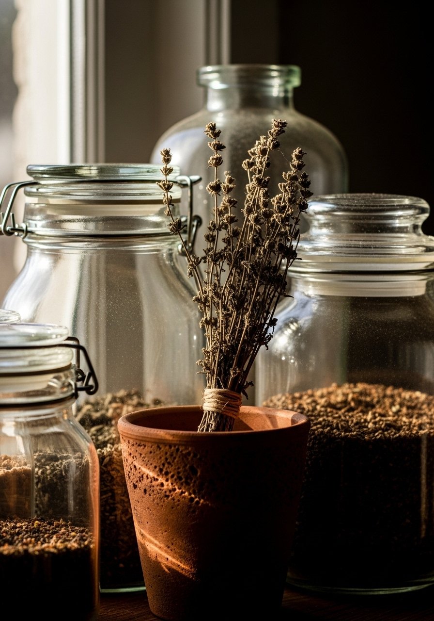 I add a living element to every third grouping. A small terracotta pot or a bundle of dried rosemary softens the glass. The change is immediate. The display stops feeling sterile and starts to feel lived-in. One insight many miss is scale. Tiny plants work better than large ones on shallow shelves. A mistake is using fake greenery that is too glossy. It reads artificial. I prefer small potted herbs on the counter where I can use them. The terracotta pot gives a warm tone against clear glass and wood.